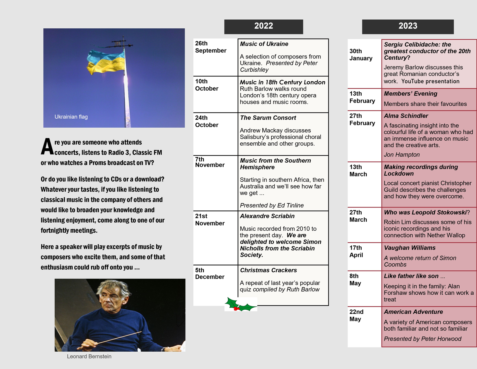 The new programme for 2022 – 23 is available and the print version can be found in the Library, TIC, and the Oxfam music Room. We have some outside speakers including someone from the Scriabin Society and old friends returning with new topics.
